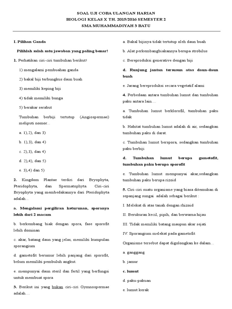 Soal Biologi Sma Kelas X Plantae Dunia Tumbuhan